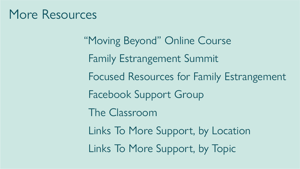 The Focused Resources For Family Estrangement are links to some of the most important online support groups and experts working in the field of family estrangement.